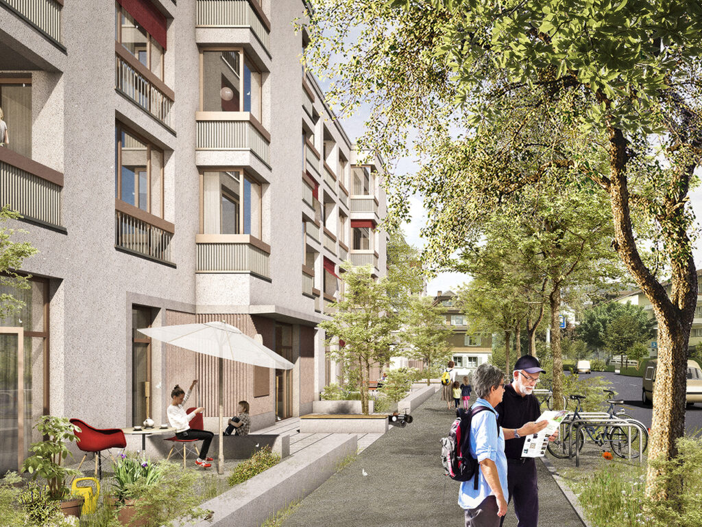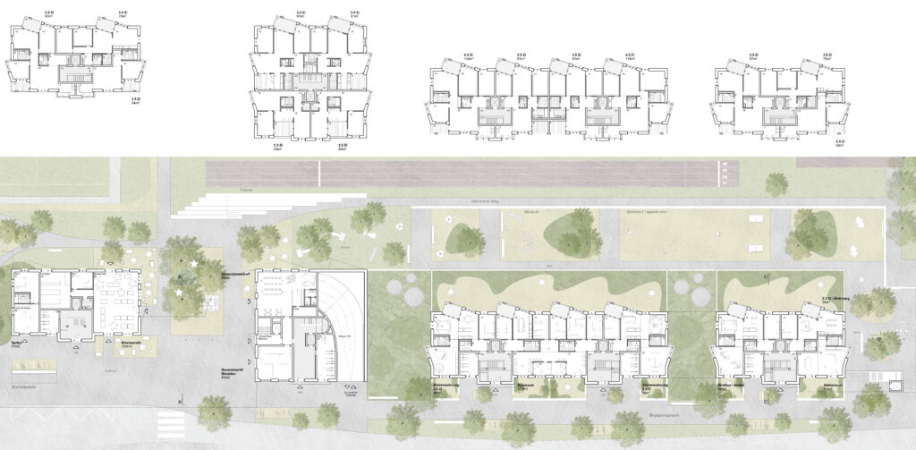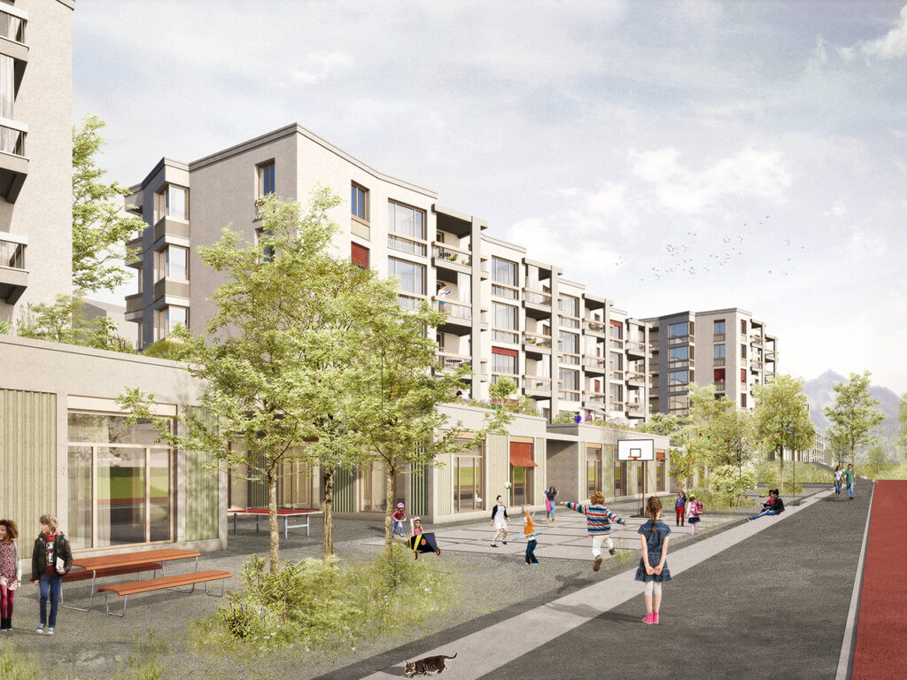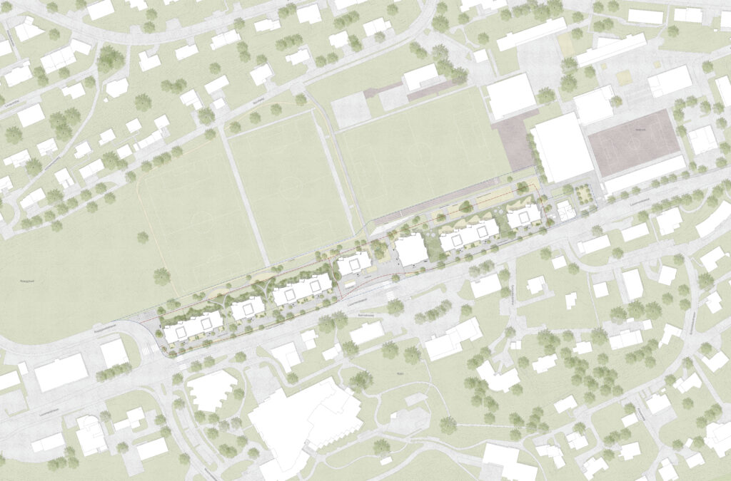 Aufgabe /// Wohnbauten mit Gewerbe-/Verkaufs- und Dienstleistungsnutzflächen / Freiraumgestaltung Strassenraum und Sportanlagen / öffentliche Tiefgarage